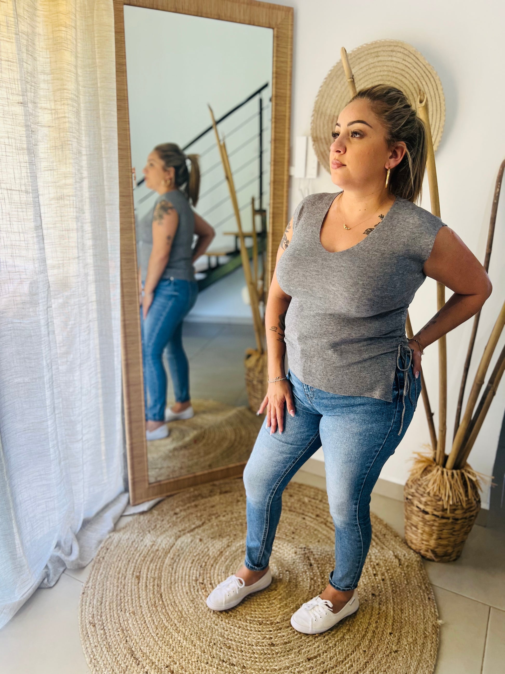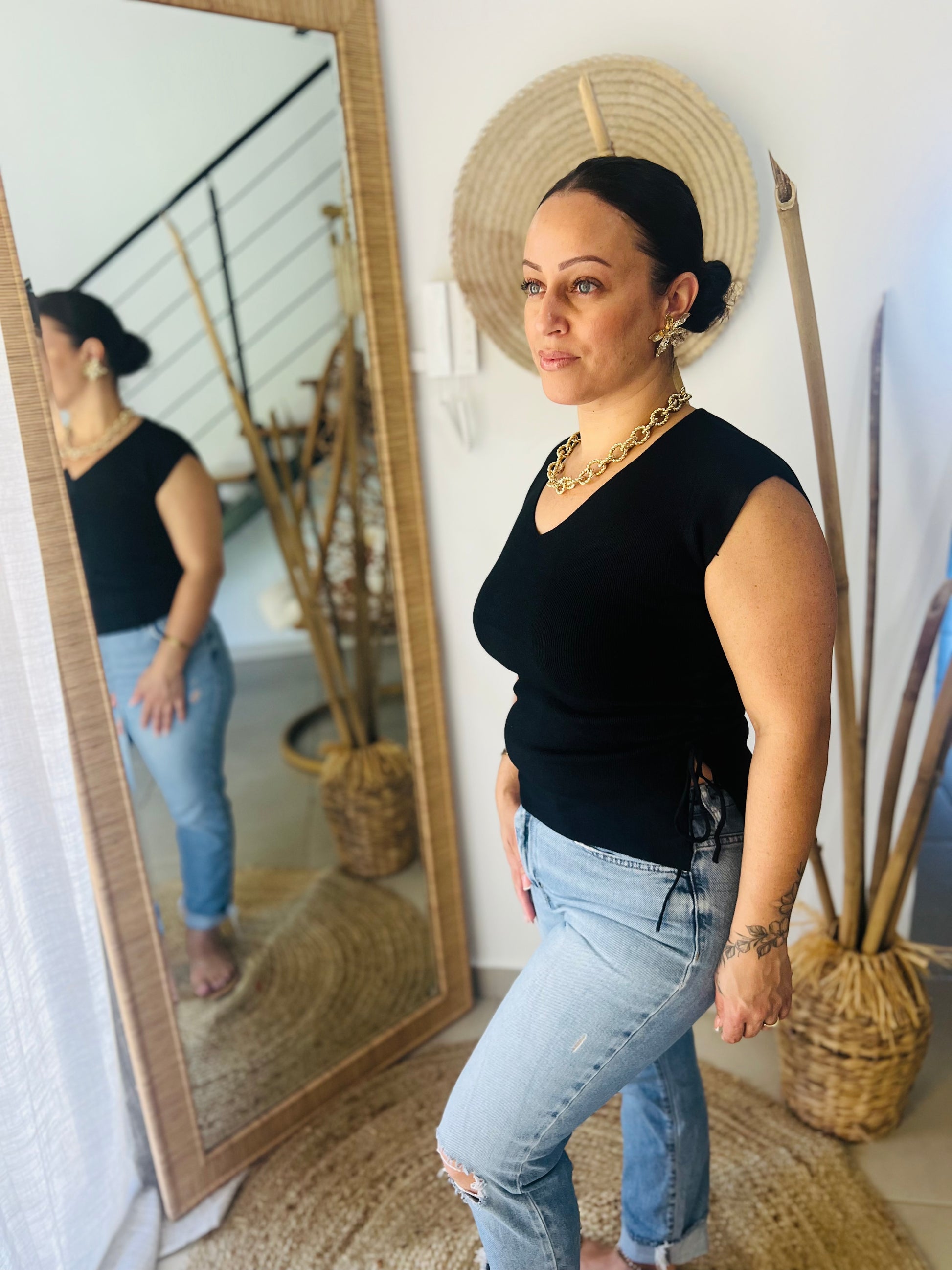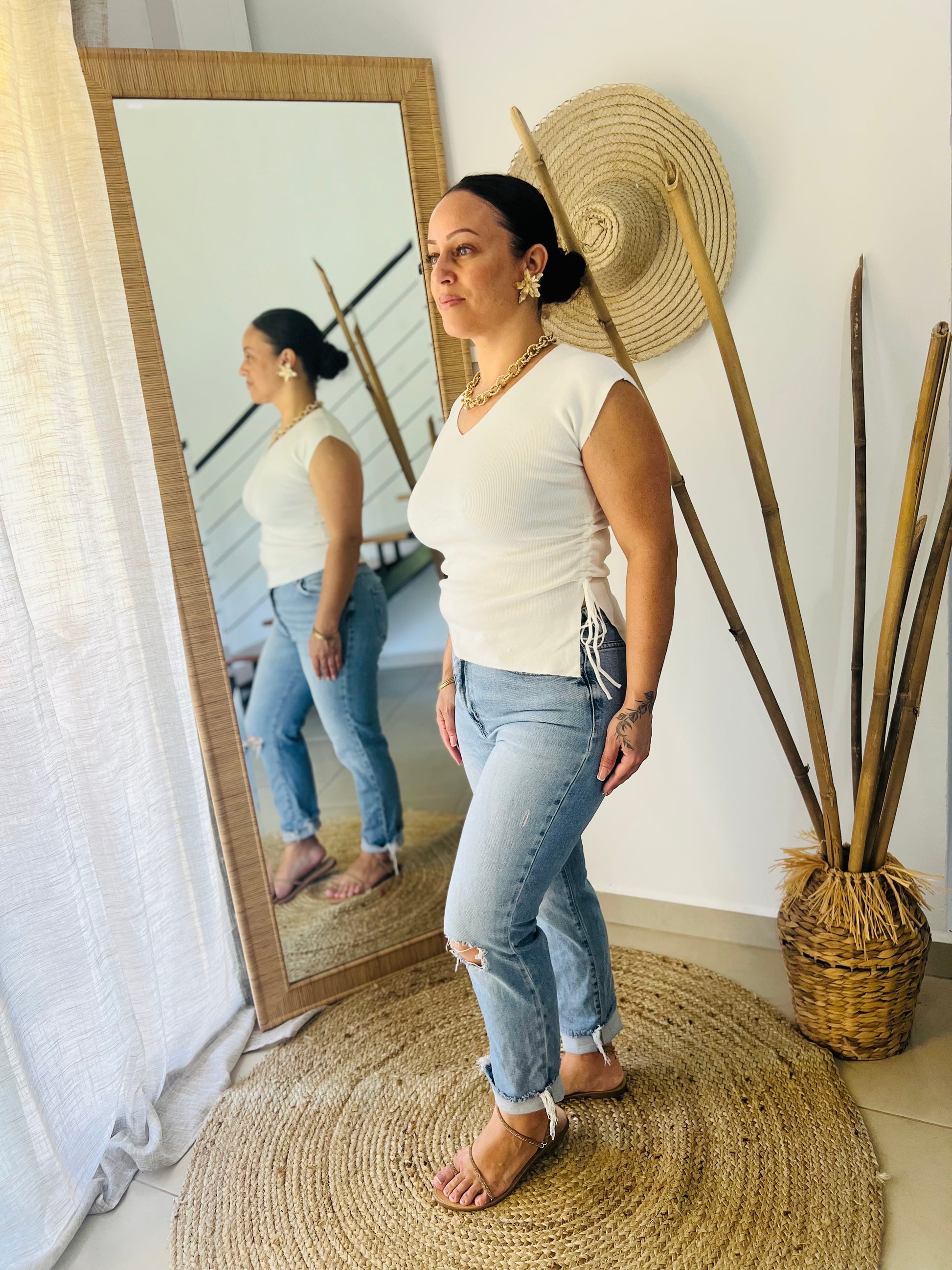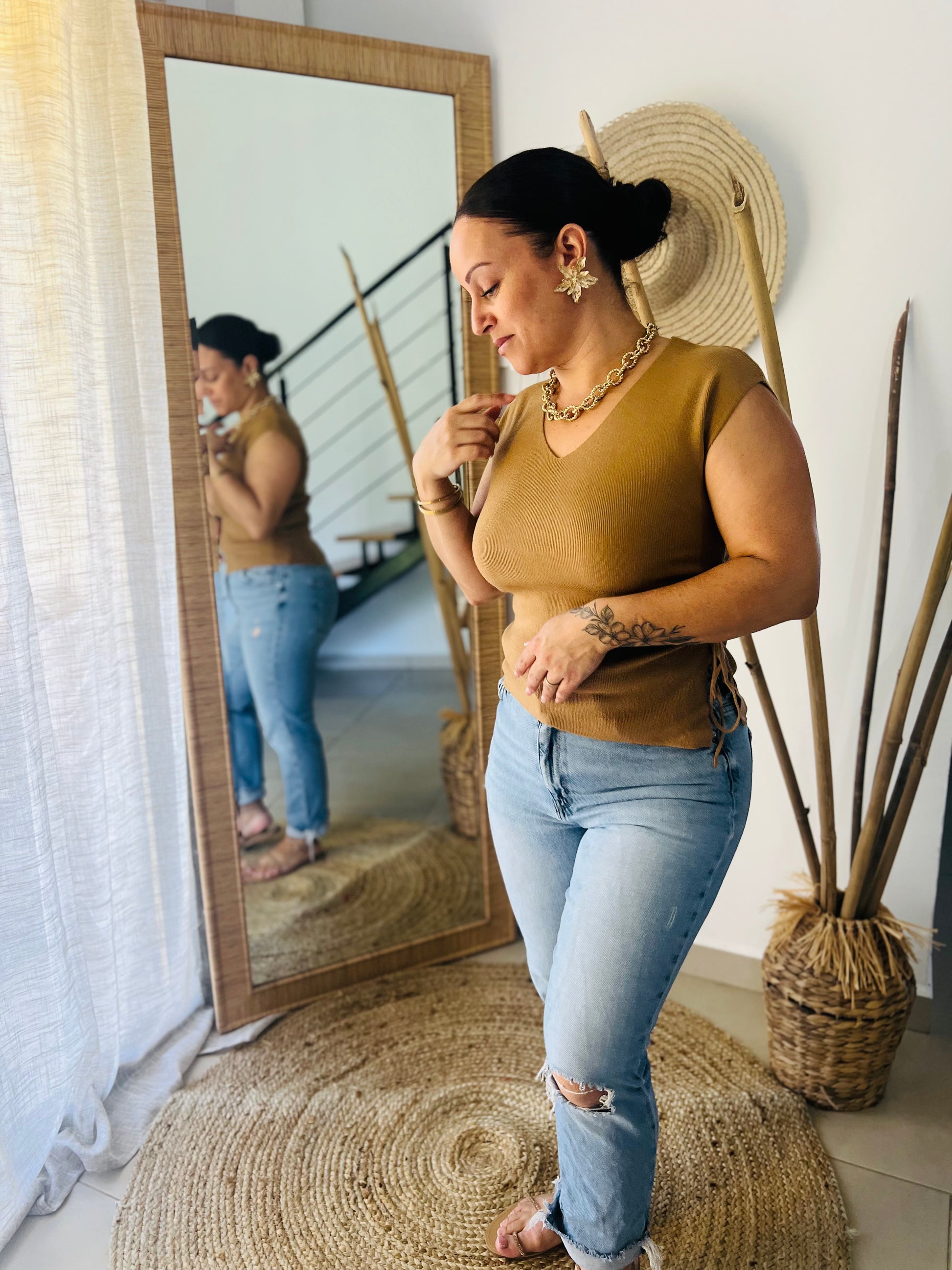 Le haut Ariane séduit par son col en V délicat et son petit lacet sur le côté, qui apporte une touche d’originalité. Léger et élégant, il se porte facilement avec un pantalon ou une jupe pour un look chic et féminin.